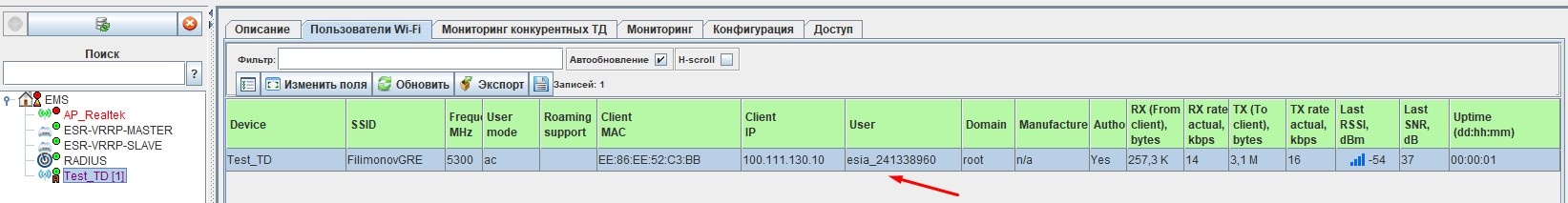 • После успешной настройки и отсутствии ошибок авторизации, у авторизованного через ЕСИА клиента, в EMS.   EMS/Точка доступа/Пользователи WI-FI/ в поле «User» появится идентификатор esia (рис. 14)