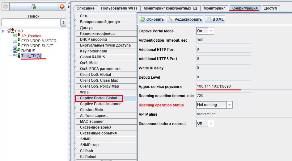 •    a. Проверьте, прописан ли модуль APB в конфигурации точки доступа:  EMS/Конфигурация/Captive Portal.Global/Адрес service роуминга/