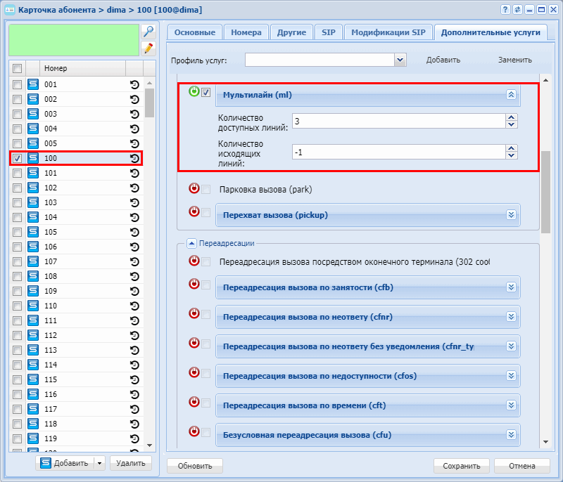 Для настройки услуги "Мультилайн (ml)" установите флаг напротив значения "Мультилайн (ml)" и установите параметры Количество доступных линий, Количество исходящих линий.