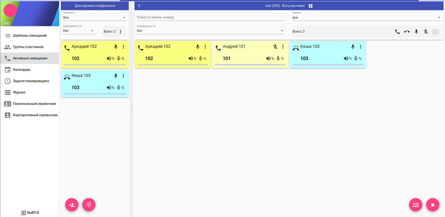 Карточки участников активного селекторного совещания отображают их текущее состояние: