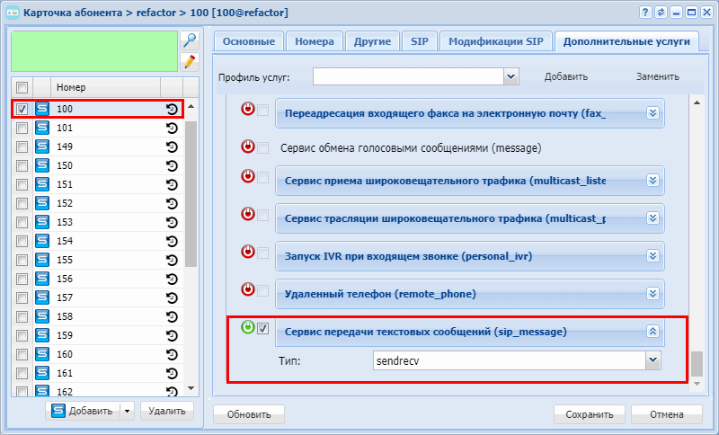 Активировать "Сервис передачи текстовых сообщений (sip_message)" для абонента с номером 100 виртуальной АТС "refactor" с разрешением на прием и передачу сообщений.