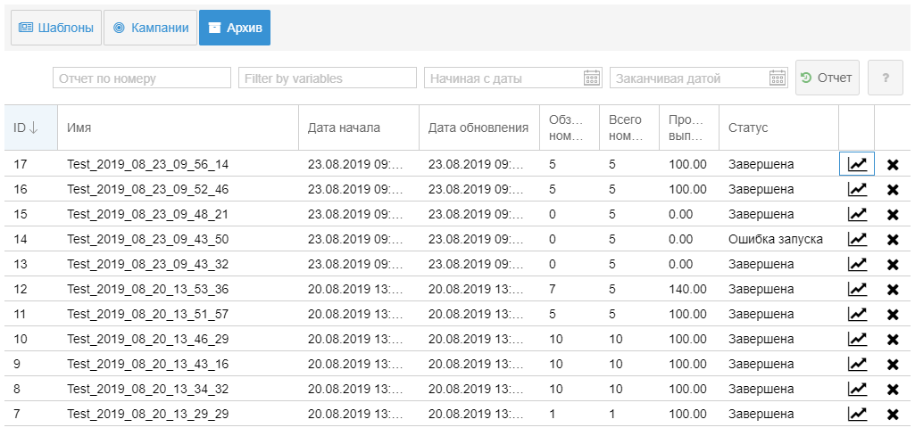 Для запуска кампании необходимо нажать на кнопку запуска напротив выбранного шаблона в окне списка шаблонов.