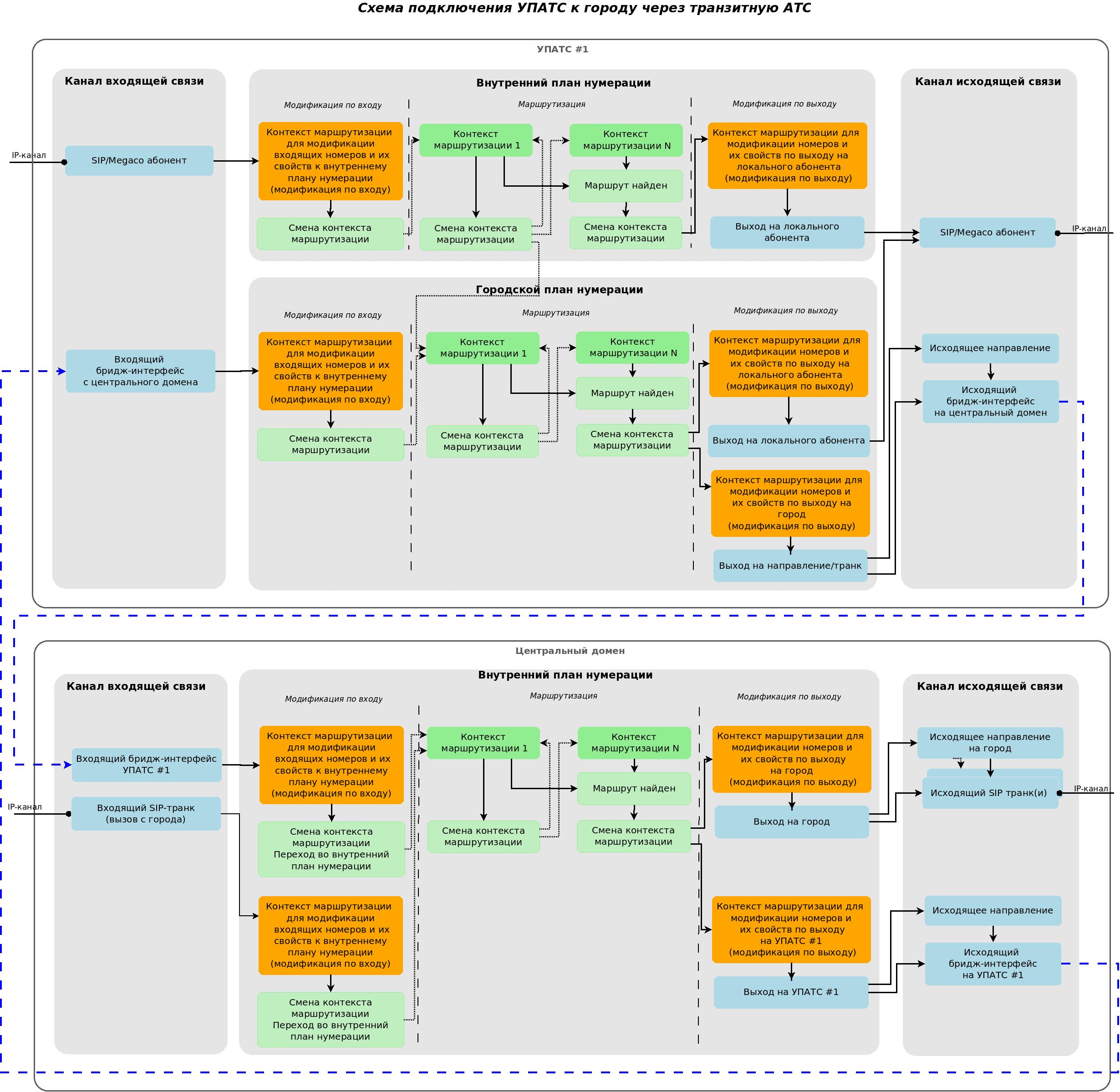 Вызов поступает с локального SIP/Megaco-абонента, направляется во внутренний план нумерации, выполняется "модификация по входу" для абонентов А, Б, после чего выполняется маршрутизация вызова. В процессе маршрутизации было определено, что абонент Б - городской абонент. Поэтому изменяем план нумерации на городской, путем перехода в один из контекстов маршрутизации в городском плане нумерации. При переходе в городской план нумерации для абонента А будут автоматически выставлены свойства "apri", "nai", "ni", "npi", "screening" для городского плана нумерации, а также номер абонента А, если у него прописан номер для городского плана нумерации. Далее, маршрутизация продолжается в городском плане нумерации. Когда маршрутизация определит направление вызова (находит bridge-интерфейс), будет выполнен переход в контекст маршрутизации для выхода на данный bridge-интерфейс. В данном контексте маршрутизации будет выполнена "модификация по выходу", в рамках которой номера абонентов А, Б, а также их свойства будут приведены к понятному в "Центральном домене" виду. Далее, вызов направляется в найденный bridge-интерфейс, пройдя через который попадает в "центральный домен" через "Входящий бридж-интерфейс УПАТС #1". В центральном домене вызов направляется в контекст маршрутизации по умолчанию для данного bridge-интерфейса, где могут быть выполнены приведения номеров А, Б, а также их свойств к внутреннему плану нумерации. Также в данном контексте может быть добавлена проверка на корректность номеров А, Б, пришедших с bridge-интерфейса. Далее, на основе модифицированных данных выполняется маршрутизация вызовов, по результатам которой будет найден маршрут до города. После этого вызов переходит в "контекст маршрутизации для модификации номеров и их свойств по выходу на город", где выполняется "модификация по выходу". Вызов поступает в направление до города.