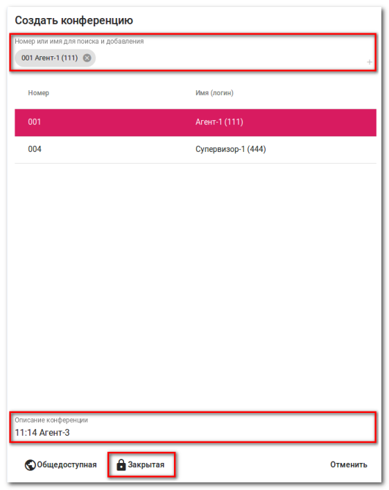 Для того, чтобы создать закрытую конференцию, оператор должен нажать на кнопку создания конференции.