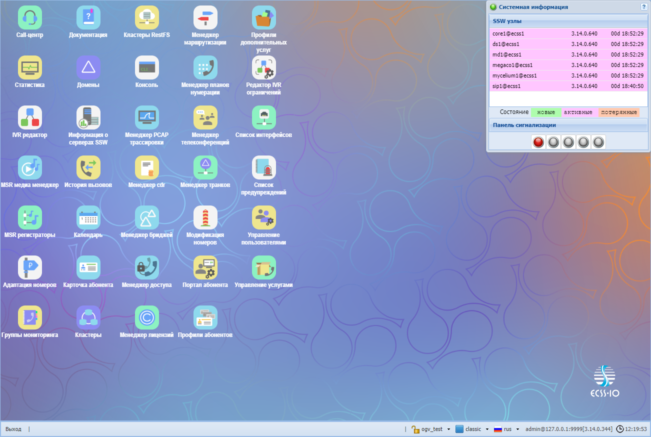 В разделе "SSW узлы" ("SSW nodes") отображается информация о нодах (версия ПО ноды, время работы), запущенных в рамках системы ECSS-10.