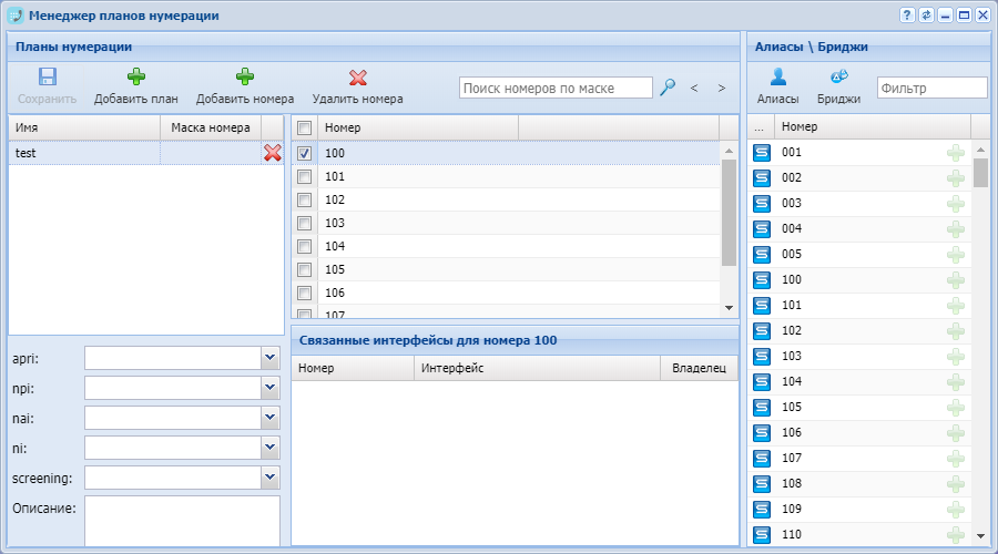 В разделе «Алиасы\Бриджи» («Aliases\Bridges») указан список алиасов и бриджей в определенной виртуальной АТС.