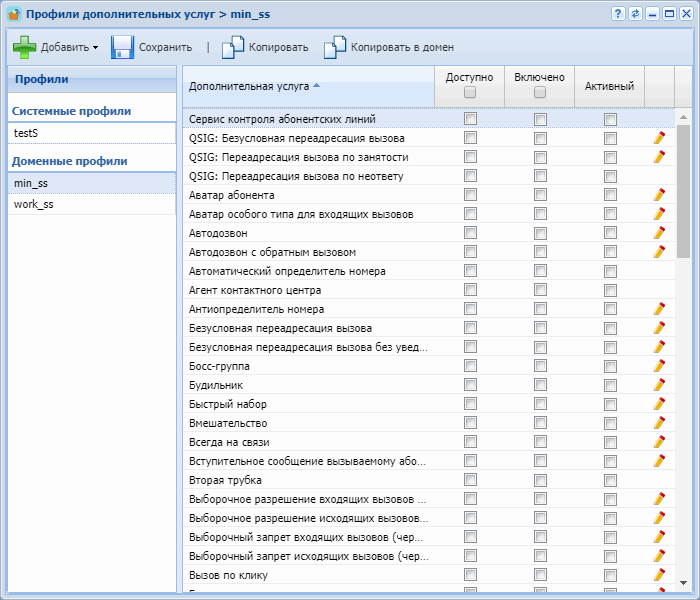 Для настройки услуг в профиле, необходимо в списке выбрать необходимый профиль для редактирования. В списке услуг появятся все установленные в системе услуги. При помощи флагов "Доступно", "Включено", "Активный" регулируется уровень доступности услуги.