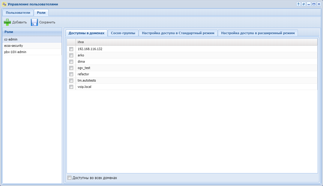 На вкладке "Доступна в доменах" ("Available in domains") указывается, в каких доменах администраторам домена можно будет назначать данные роли для создаваемых пользователей. Администратор домена может создать пользователей в рамках заданного домена и выбрать для них только определенные роли. По умолчанию администратор домена создает пользователей с такой же ролью, как у себя. Администратор домена не может удалять роль у себя или пользователей домена.