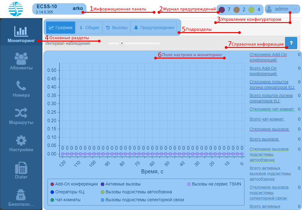 | 3.14.3 Мониторинг | просмотр общей информации о системе, статистики по вызовам абонентов в виде графиков и таблиц, информации о предупреждениях | |