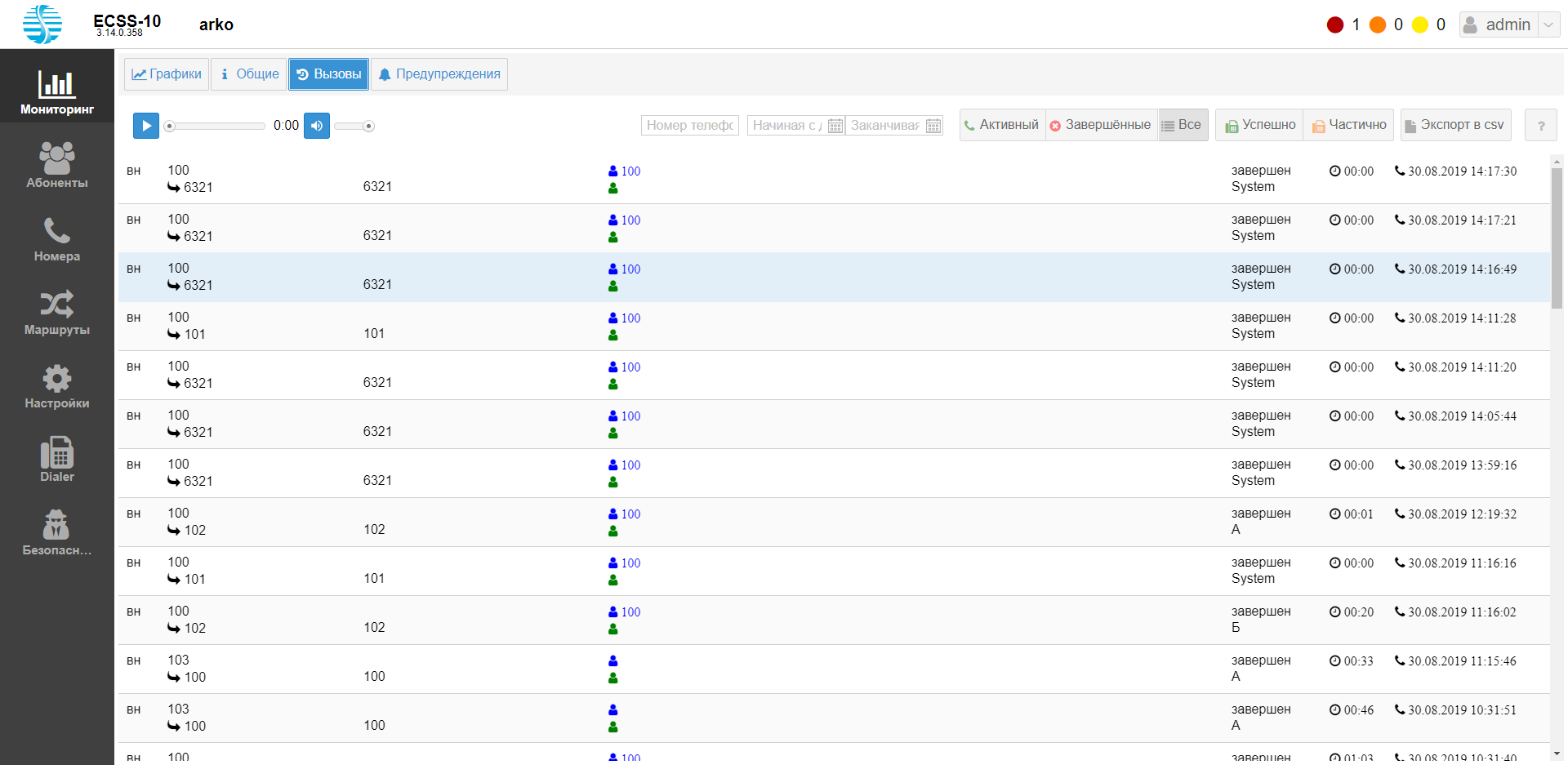 В разделе "Вызовы" ("Сalls") выполняется мониторинг вызовов в системе.