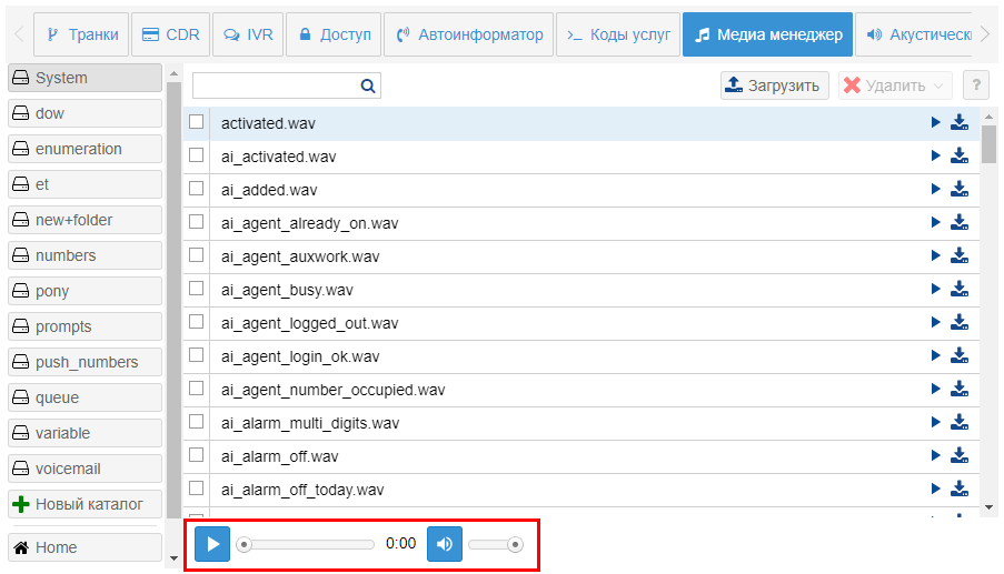 В приложении есть системные и пользовательские каталоги с аудио-файлами. Системные папки System, queue, numbers, enumeration, et и их содержимое не может быть изменено. Для нужд пользователя существуют пользовательские каталоги, в которые можно загружать собственные звуковые аудио-файлы. Загружаться в медиа менеджер могут файлы формата wav, кодеки a-law, u-law 8 bit; pcm 16 bit.