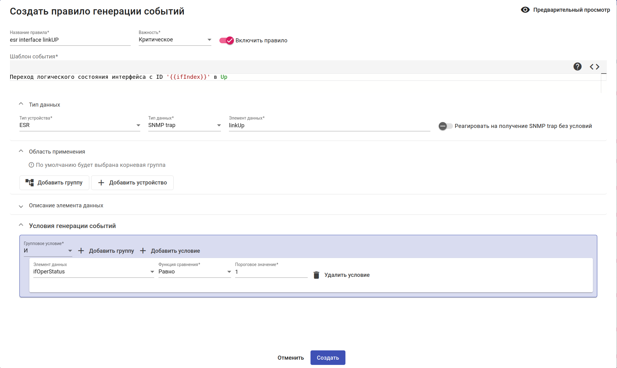 Создать два правила генерации событий для всех маршрутизаторов ESR с уровнем важности "Критическое" и названиями "esr interface linkDown" и "esr interface linkUp", которые будут срабатывать, если система зарегистрирует трапы "linkDown" и "linkUp".