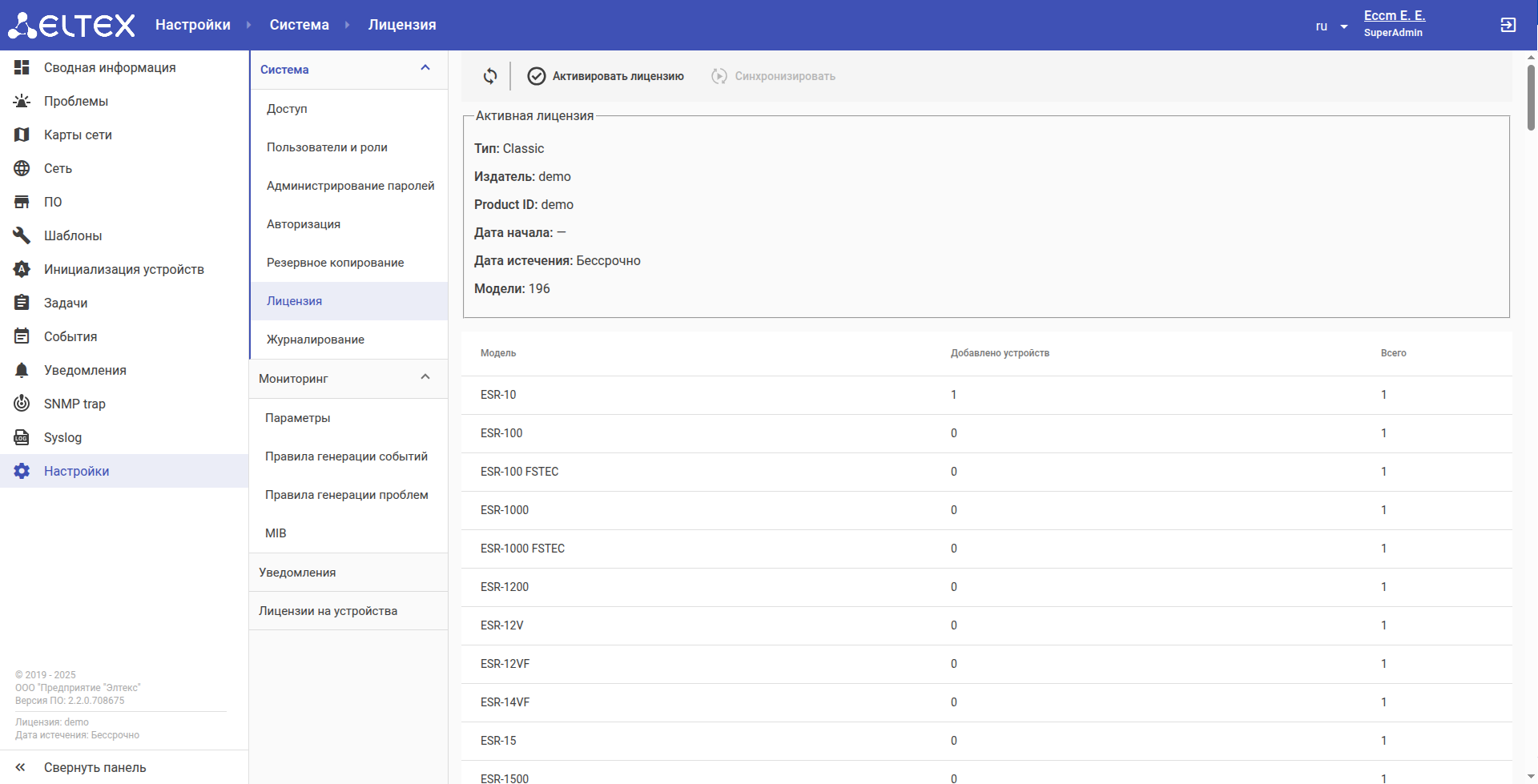 После установки система предоставляет бессрочную демо-лицензию на 1 устройство каждой модели. Для того чтобы работать со множеством устройств одной модели, необходимо установить соответствующую лицензию.