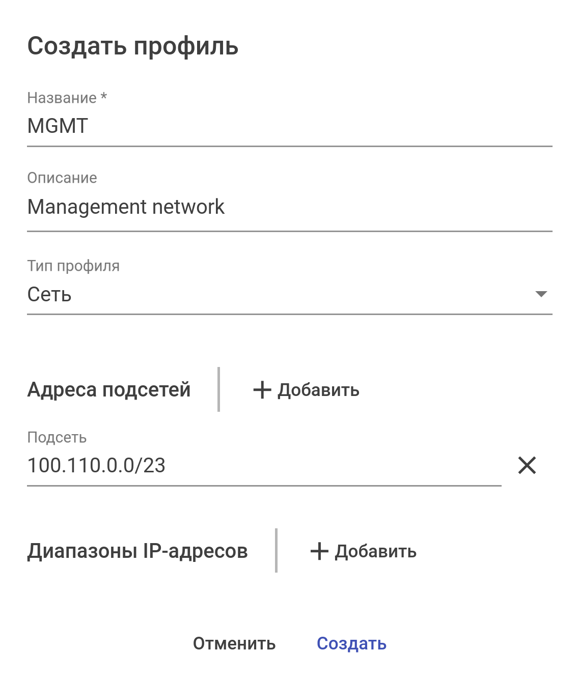 Для создания профиля для сети управления: