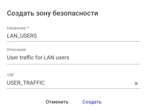 Чтобы настроенные ранее правила применялись к трафику конкретного интерфейса, необходимо включить интерфейс в зону безопасности. Включение интерфейса в экземпляр VRF позволит изолировать пользовательский трафик от остального. Также на интерфейсе необходимо настроить IP-адрес, если это не было сделано ранее.
