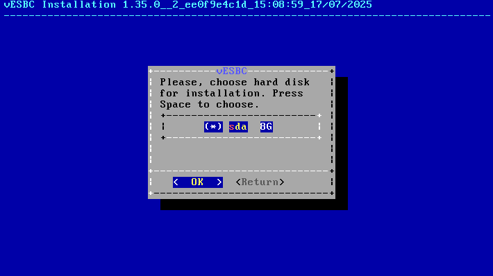 Шаг 3. Выберите созданный виртуальный диск, на который необходимо установить vESBC. Для выбора необходимо нажать на "Пробел", выбрать клавишу "ОК" и нажать "Enter":