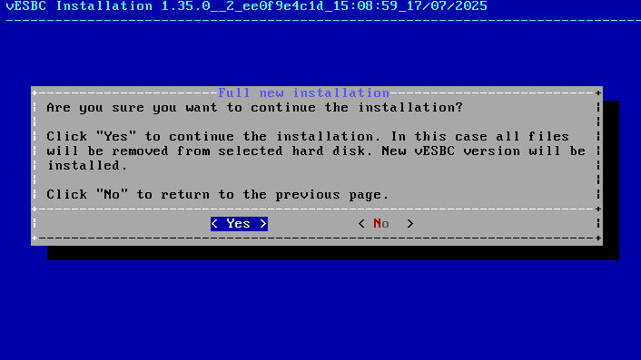 Шаг 5. В случае если на каком-либо этапе была допущена ошибка, возможно вернуться на предыдущие страницы, выбрав "No". Если ошибок допущено не было, можно продолжить установку vESBC, выбрав "Yes":