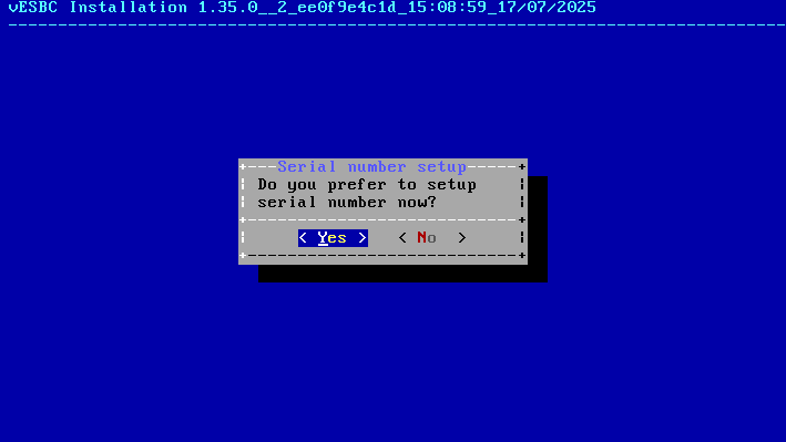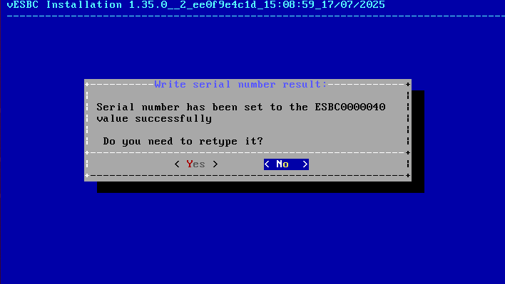 Шаг 8. Если был введен неверный серийный номер, выберите "Yes", чтобы ввести заново. Если был введен корректный серийный номер, выберите "No", чтобы продолжить установку vESBC: