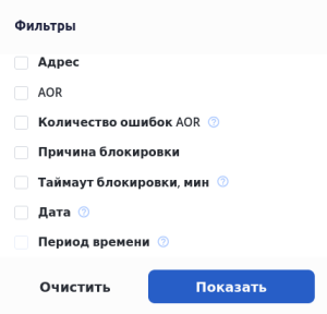 • Таймаут блокировки, мин – время, в течение которого адрес будет оставаться заблокированным. Для поиска необходимо ввести целое число или интервал;