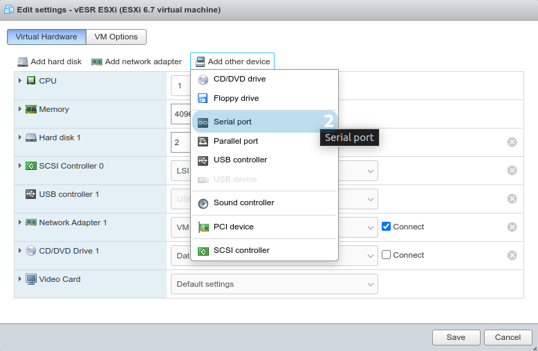 Шаг 5. Выберите Virtual Hardware для будущего vESR, обязательно не менее 3 ГБ RAM (оптимально 4 ГБ) и не менее 500 МБ хранилища. "SCSI Controller" должен быть выставлен в "LSI Logic Parallel". "Controller location" для "Hard Disk" выставите в "IDE controller". По необходимости добавьте сетевые интерфейсы.