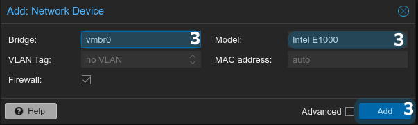 Шаг 3. Выберите необходимый сетевой мост и модель сетевой карты и нажмите "Add":