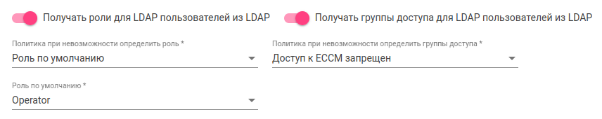 Для присвоения системных ролей пользователям, которые проходят авторизацию в ECCM через LDAP, активируйте переключатель "Получать роли для LDAP пользователей из LDAP" и выберите политику, которая будет по умолчанию применяться к LDAP-пользователям, для которых не получилось определить роль.