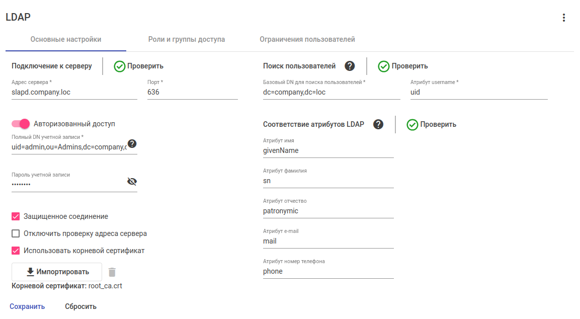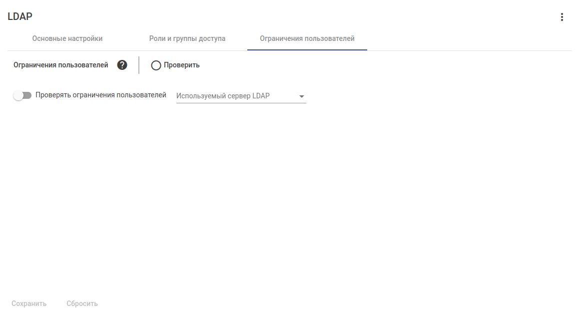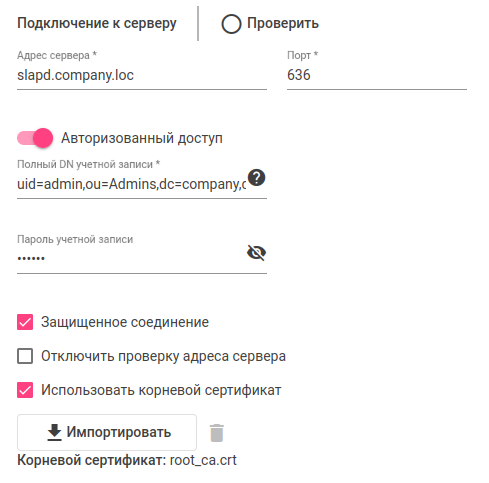 Чтобы протестировать соединение с LDAP-сервером, нажмите кнопку "Проверить", расположенную справа от заголовка раздела.