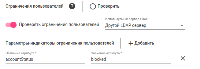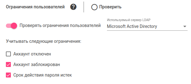 Если включена проверка ограничений, то при авторизации LDAP-пользователя система проверит соответствующие атрибуты его LDAP-записи и, если условие ограничения будет выполняться, автоматически заблокирует ему доступ.