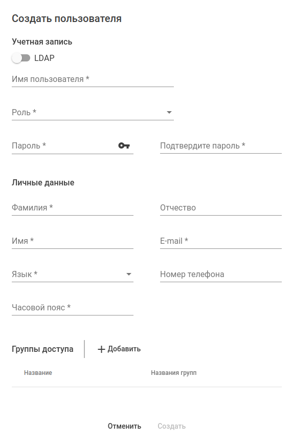 2. Нажмите кнопку "Создать". Откроется окно создания пользователя: