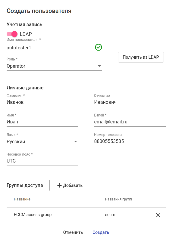 Поля будут заполнены при условии корректной настройки соответствия атрибутов LDAP параметрам учетной записи пользователя системы управления ECCM в разделе "Соответствие атрибутов LDAP" в виджете "LDAP" на странице "Настройки" → "Авторизация".