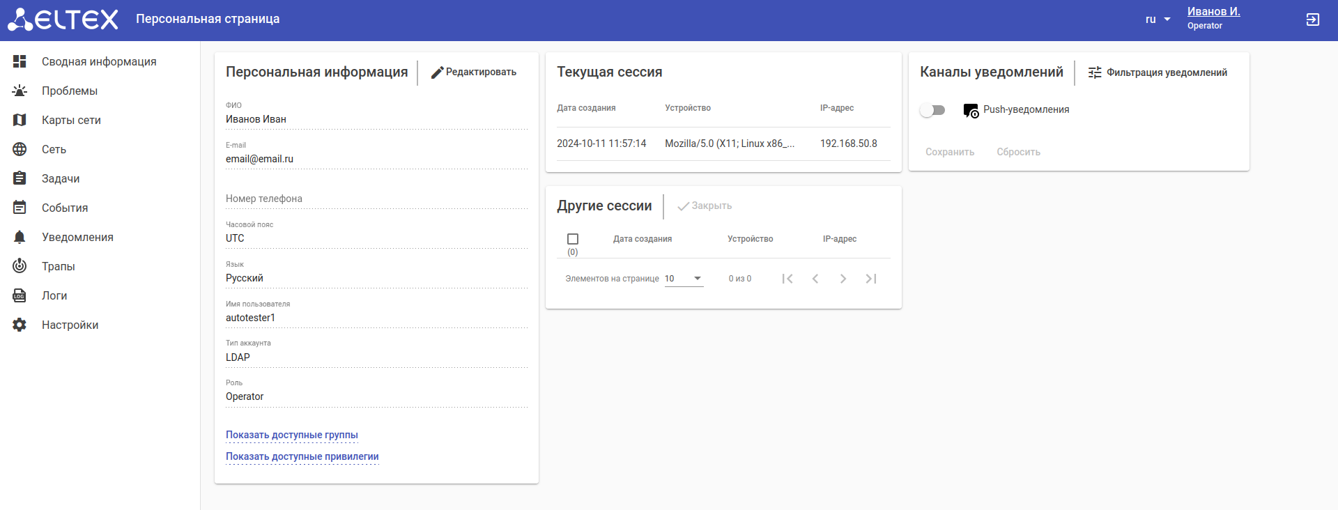 При настроенной аутентификации через LDAP логин и пароль для доступа к системе определяются соответствующей учетной записью на LDAP-сервере.