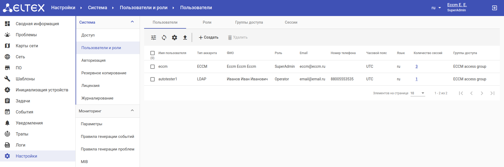 Учетная запись пользователя будет отображена в таблице на странице "Настройки" → "Система" → "Пользователи и роли" → "Пользователи":