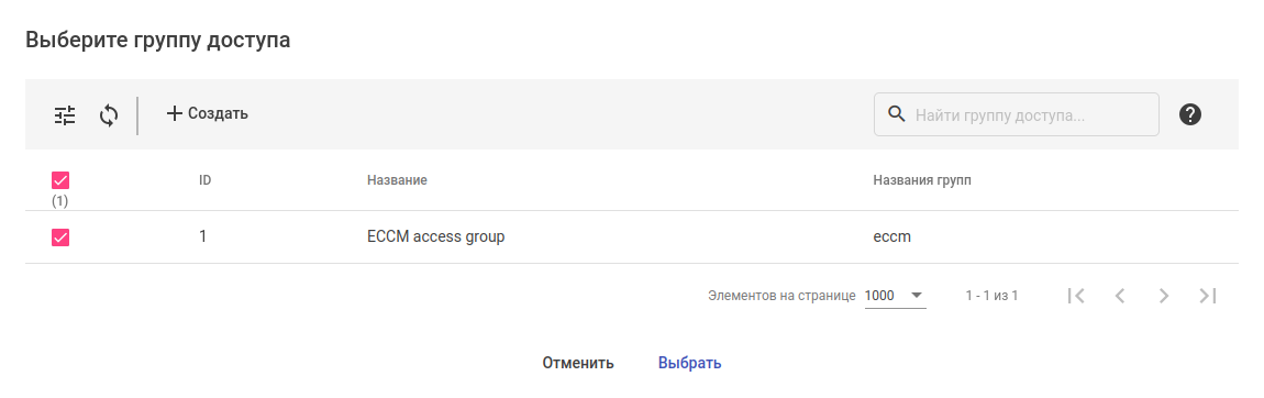 9. В блоке "Группы доступа" нажмите кнопку "Добавить". В открывшемся окне выберите группу доступа, доступ до которой будет открыт пользователю, и нажмите кнопку "Выбрать":