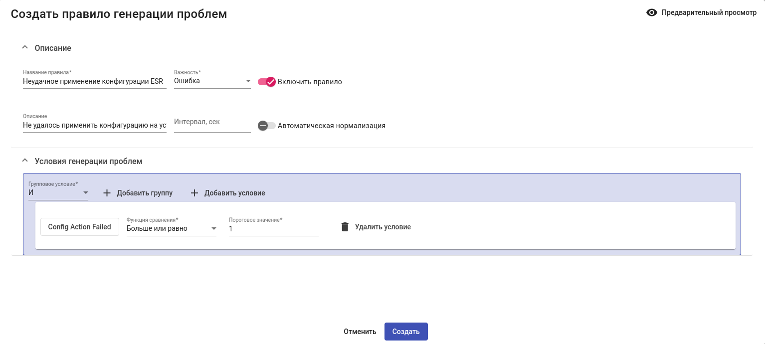 Описание условия: Проблема "Неудачное применение конфигурации ESR" будет создана в случае регистрации системой одного или нескольких системных событий "Config Action Failed".