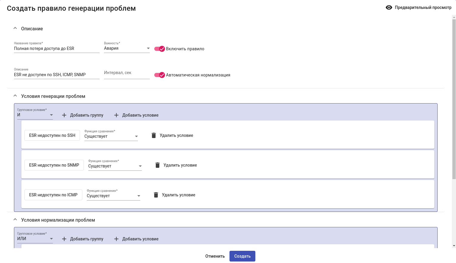 - "Автоматическая нормализация" — активировано. Проблема будет автоматически закрыта в случае выполнения условия ее нормализации.