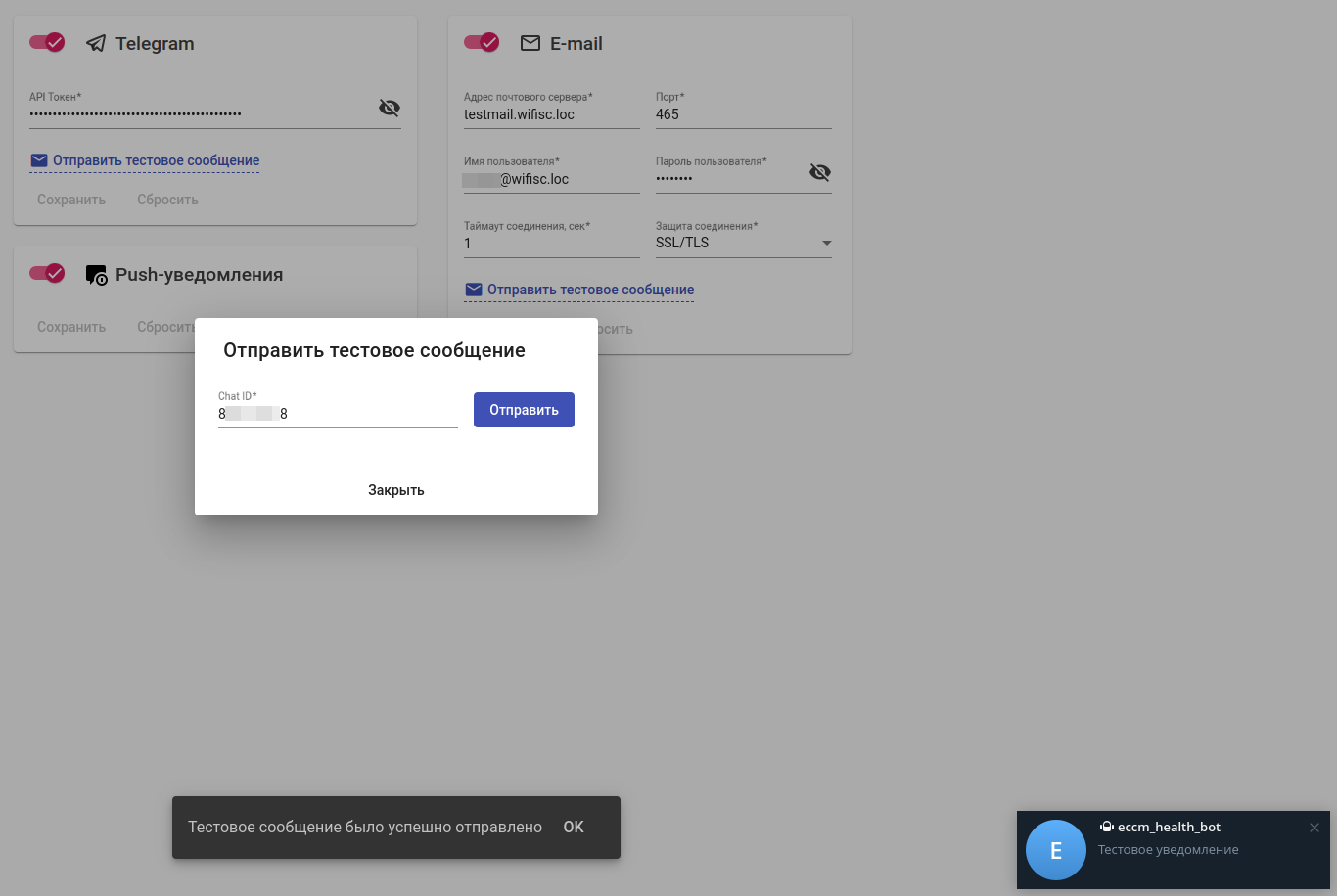 Для проверки корректности настроек нажмите на ссылку "Отправить тестовое сообщение": откроется соответствующее диалоговое окно. В поле "Chat ID" введите ID Telegram-чата, в который придет тестовое сообщение, и нажмите кнопку "Отправить":