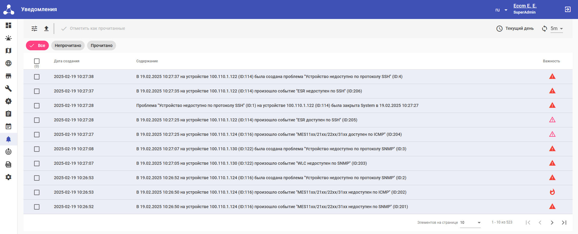 Уведомления позволяют своевременно оповещать операторов и администраторов системы управления ЕССМ о: