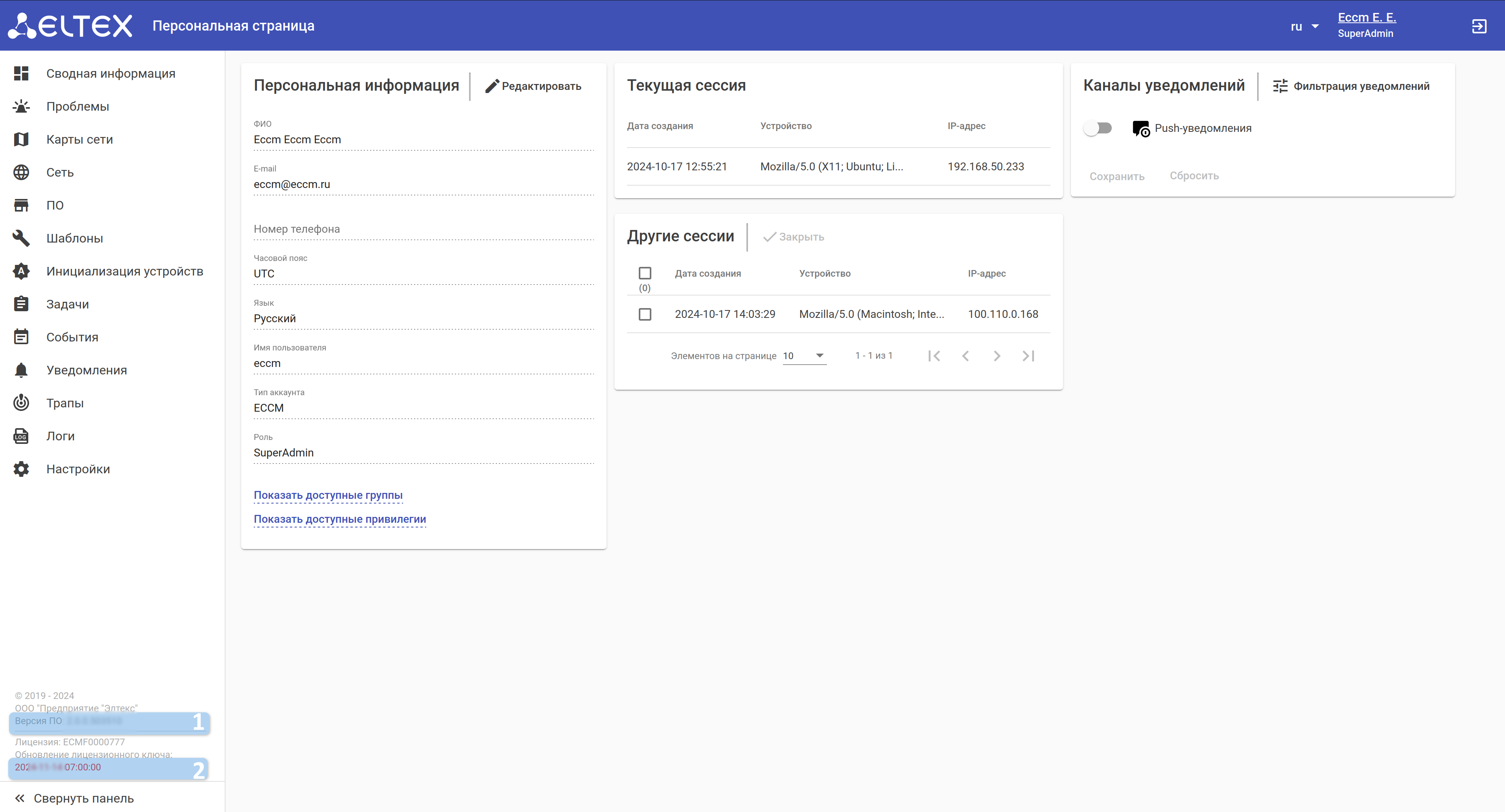 - Установленная версия ECCM и используемая лицензия;