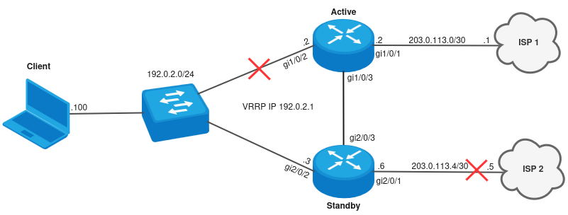В таком случае SLA-1 тест перейдет в состояние Fail, после чего track-1 перейдет в состояние down - в результате пропадет маршрут по умолчанию через ISP 1, понизится VRRP-приоритет Active в сторону LAN-подсети и трафик будет ходить через Standby. Также со стороны Standby упадет SLA-4 тест и пропадет резервный маршрут по умолчанию через gi2/0/3.