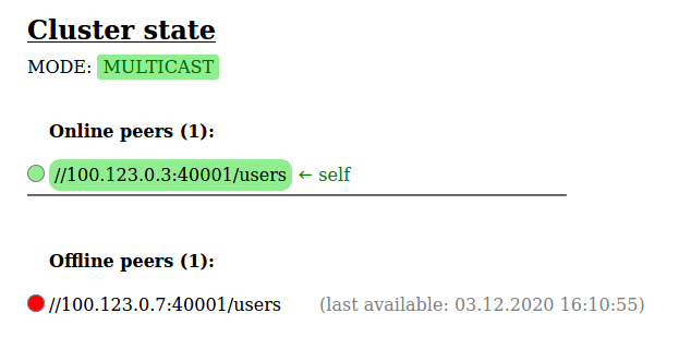 Как видно на приведенном рисунке отображается режим работы кластера и ноды, состоящие в кластере. Так пометкой "self" указана нода, на которой выполняется просмотр данной информации.