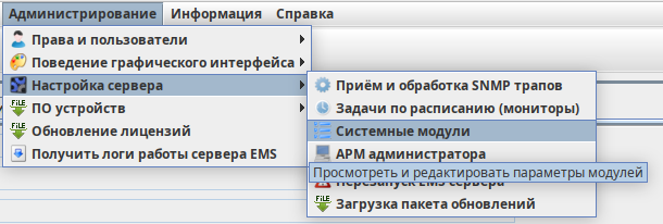 1) Перейти в раздел "Администрирование" → "Настройка сервера" → "Системные модули"