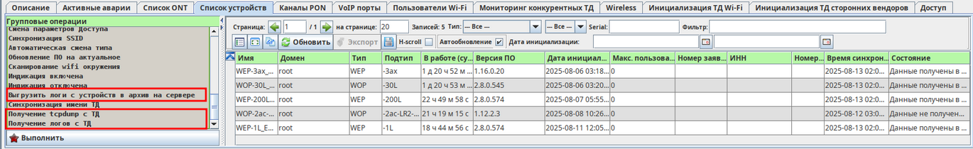 Для этого необходимо перейти в список устройств, выбрать нужные точки и действие с ними после чего нажать "Выполнить".