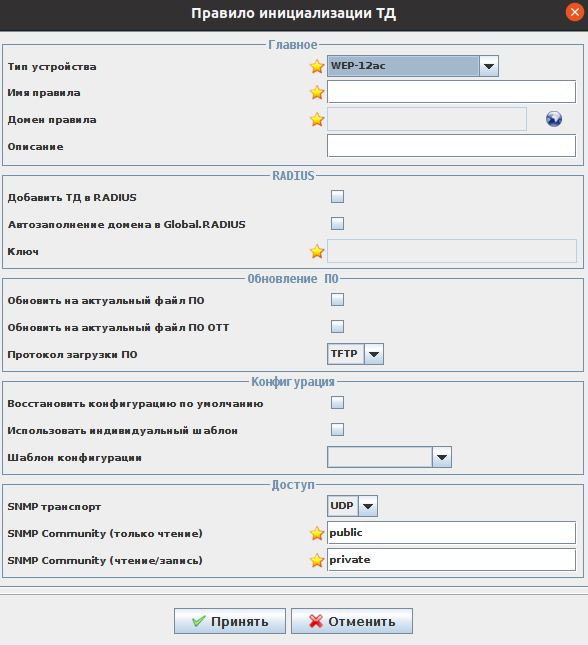 • "Инициализация ТД" - процесс добавления ТД в дерево устройств EMS в соответствии с найденной привязкой инициализации (добавление в таблицу RADIUS, назначение признака OTT, SNMP параметров доступа) и выполнения конфигурирования в соответствии с назначенным шаблоном и привязкам SSID назначенного ей домена.