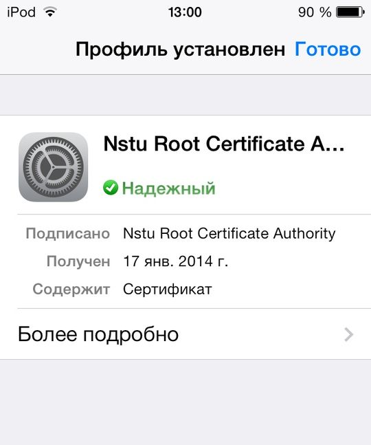 Открыв письмо с вложенным файлом стандартными приложениями IOS (Safari, Mail), нажимаем на файл с расширением *.crt. При Установке сертификата система будет предупреждать о ненадежности профиля, Вам необходимо согласиться на установку и сертификат будет успешно установлен.