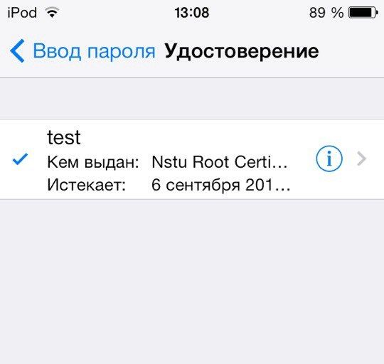 В меню настройки Wi-Fi находим нужную сеть. При подключении к сети вводим свой личный логин, выбираем режим EAP-TLS. Нажимаем на пункт удостоверение, ставим галочку на наш сертификат, возвращаемся назад на ввод пароля, жмем подключиться. В появившемся окне жмем кнопку принять.