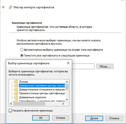 Необходимо выбрать хранилище сертификатов. Выберите пункт "Поместить все сертификаты в следующее хранилище" и нажмите "Обзор". В открывшемся окне выберите "Доверенные корневые центры сертификации".