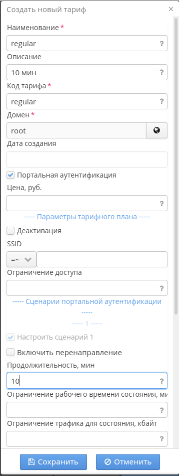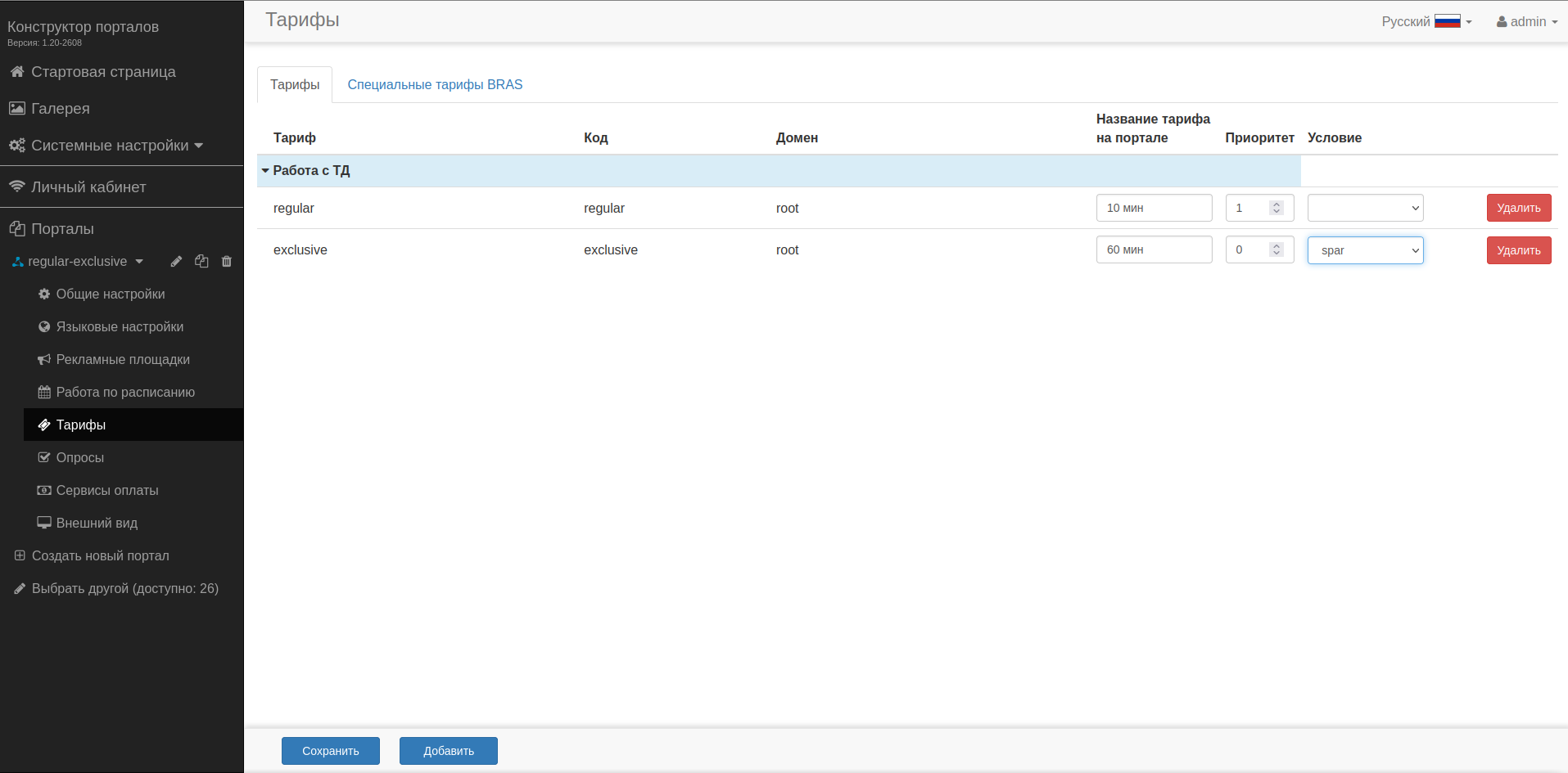 Перейти в раздел "Тарифы", удалить тариф "Hotspot Default", добавить ранее созданные тарифы "exclusive" и "regular" и нажать кнопку "Сохранить".