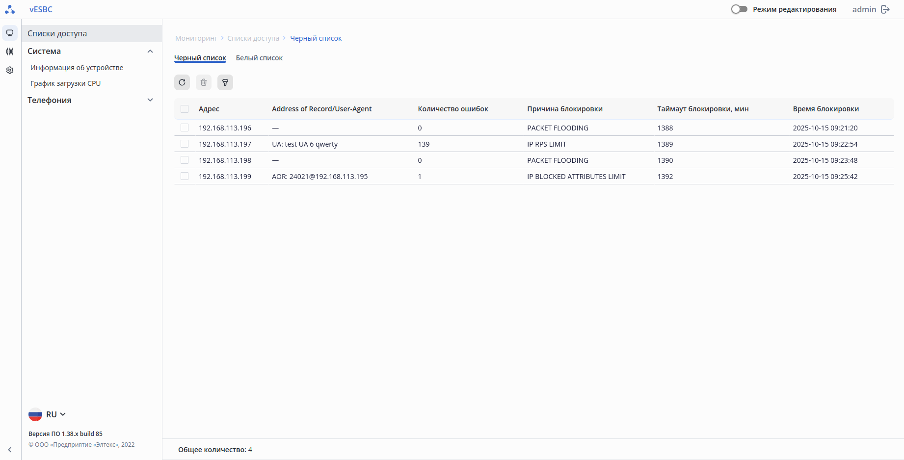 • DISTRIBUTED SPAM – превышено максимальное количество IP-адресов с одинаковым заблокированным атрибутом (AOR, User-Agent);