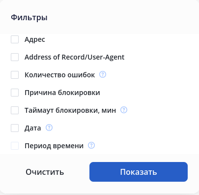 • Таймаут блокировки, мин – время, в течение которого адрес будет оставаться заблокированным, указывается в минутах;