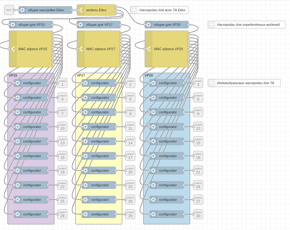 Для каждого производителя создан субпоток, внутри которого продолжается разделение по моделям и по MAC-адресам. Такое разделение позволяет размещать узел Configurator (узел настроек) на каждом этапе и задавать общие настройки для отдельной группы устройств или для всех устройств сразу. Например, такие настройки как: часовой пояс, адрес AuP или адрес NTP-сервера можно настроить на все устройства. А такой параметр как Common SIP Line можно настроить для каждого домена свой.